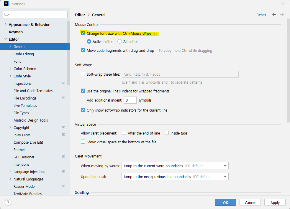 위 메뉴로 이동하여, 'Change font size with Ctrl+Mouse Wheel in' 항목을 선택하고, Apply 버튼을 클릭합니다.