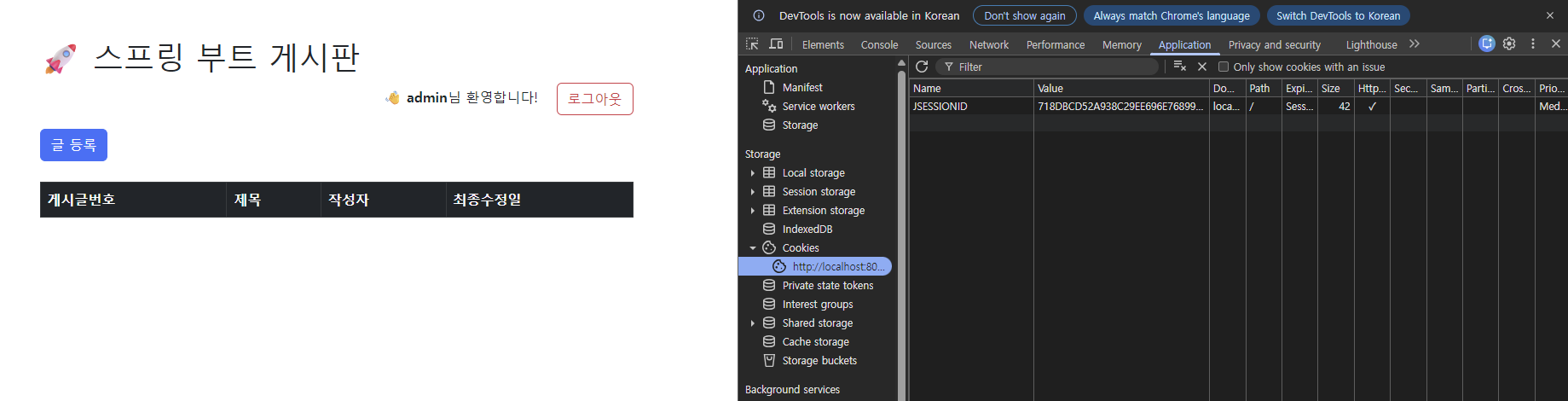 - 왼쪽 메뉴에서 Storage -> Cookies -> http://localhost:8080 클릭