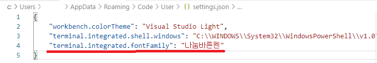 위의 예제에서 폰트를 나눔바른펜으로 지정하였기 때문에 'terminal.integrated.fontFamily' 속성값이 추가된 것을 확인 할 수 있습니다.