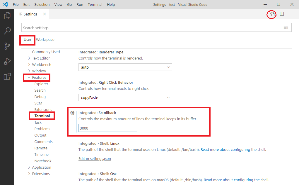 2. User > Features > Terminal > Integrated:Scrollback 항목 설정