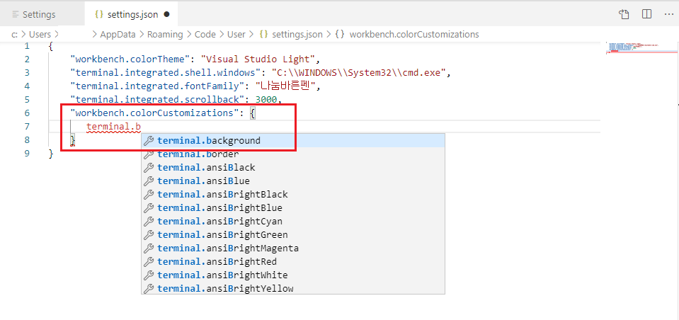 VSCode의 터미널 배경색과 글자색을 변경하는 방법입니다.
