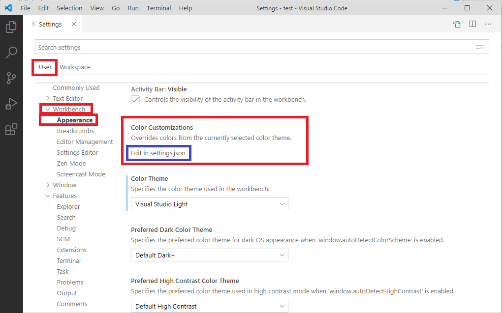 3. "workbench.colorCustomizations" 속성을 정의합니다.