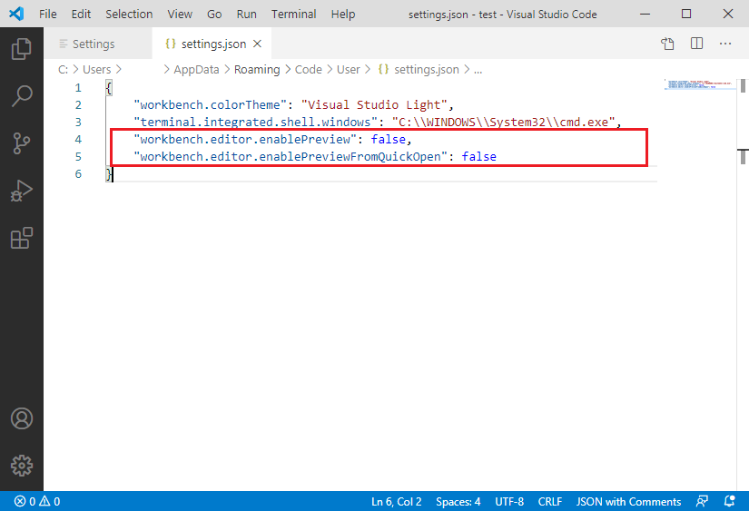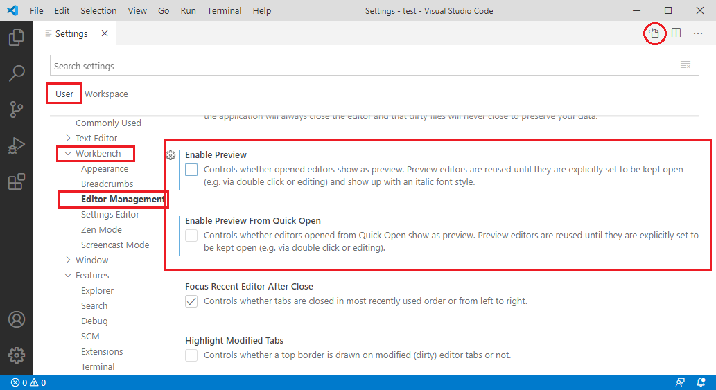 "Enable Preview"와 "Enable Preview From Quick Open" 속성의 체크를 해제합니다.