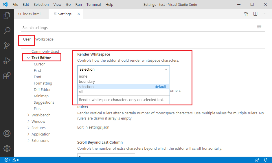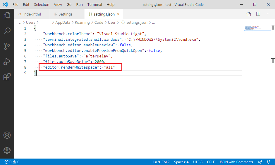 - editor.renderWhitespace 속성을 추가해 줍니다.