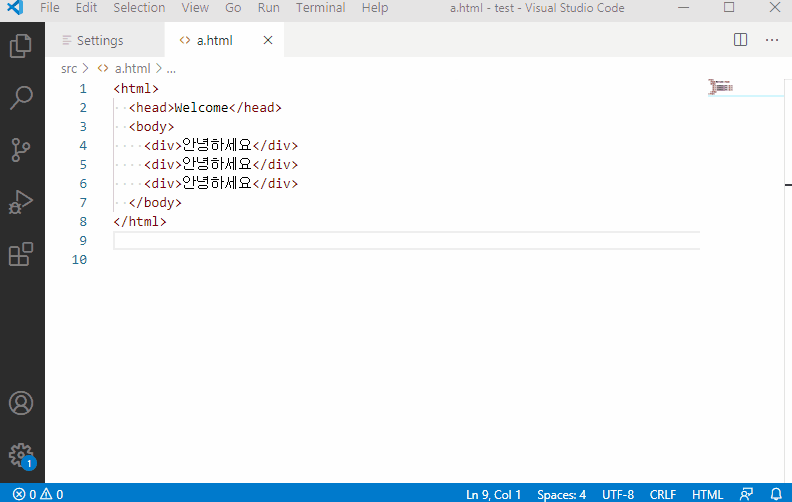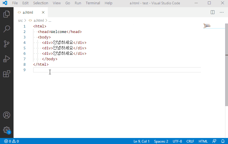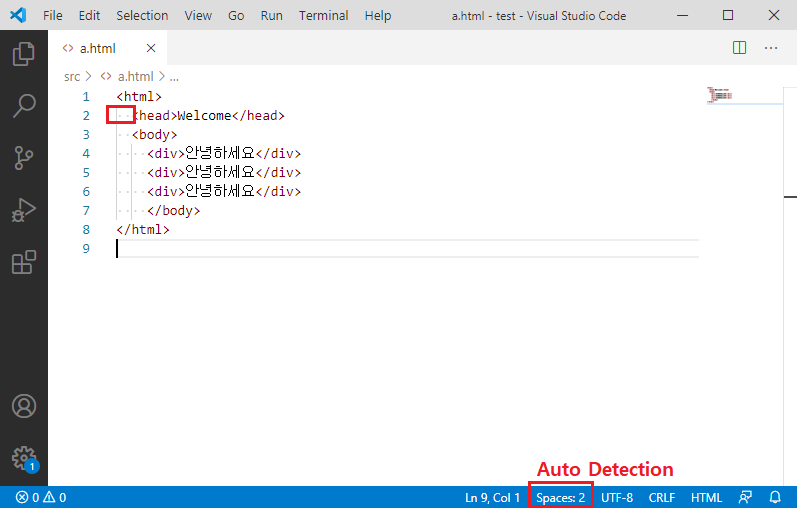화면 하단의 상태바에 'Spaces: 2'라고 나오는 것을 볼 수 있습니다.