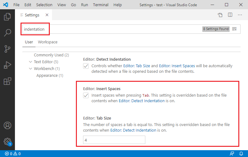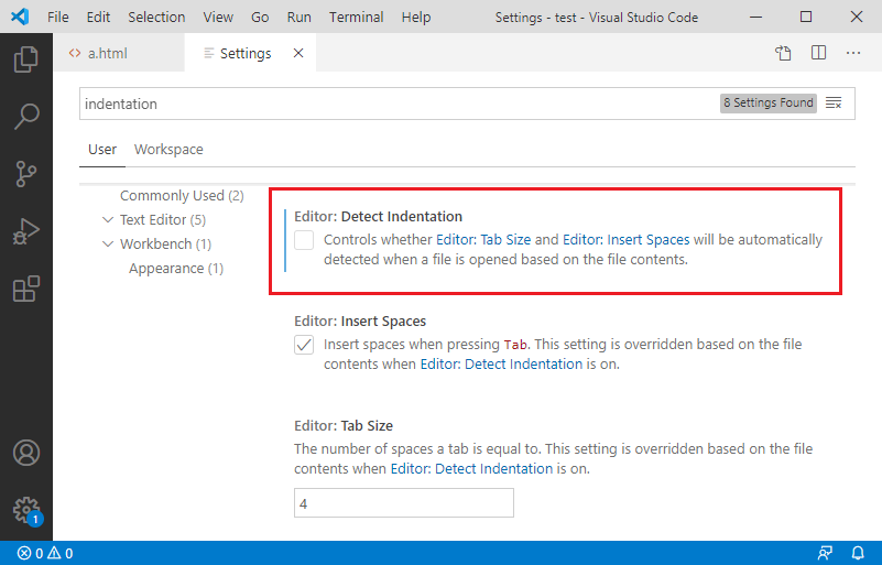 VSCode는 파일을 열었을 때 자동으로 들여쓰기 간격을 알아냅니다.
