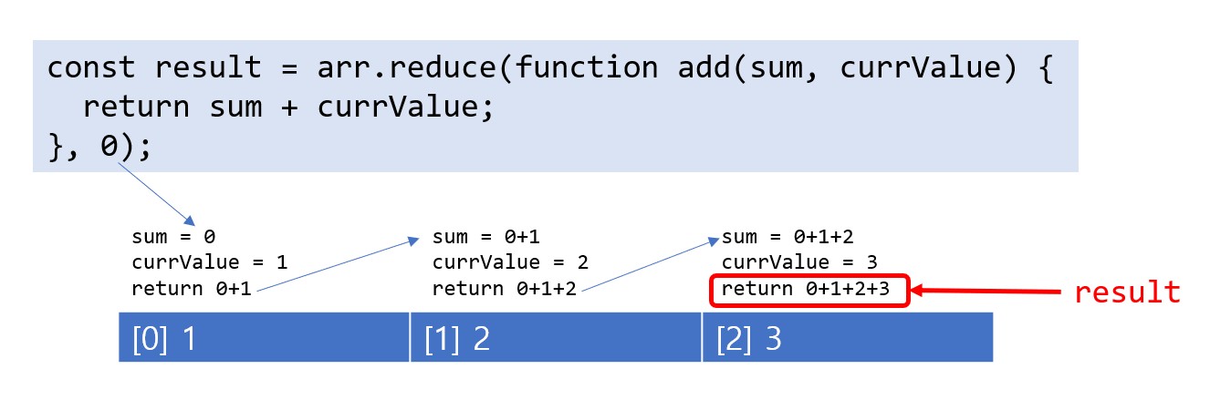 누적값(sum), 현재 처리중인 배열의 element(currValue)를 파라미터로 받습니다.