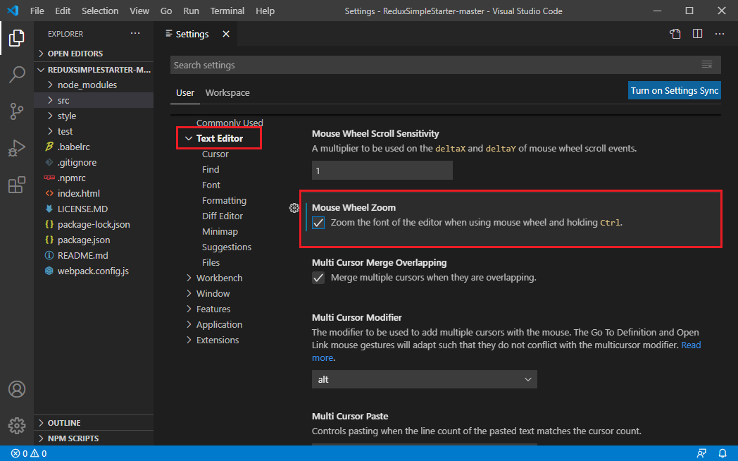 (1) Setting > User > Text Editor > Mouse Wheel Zoom