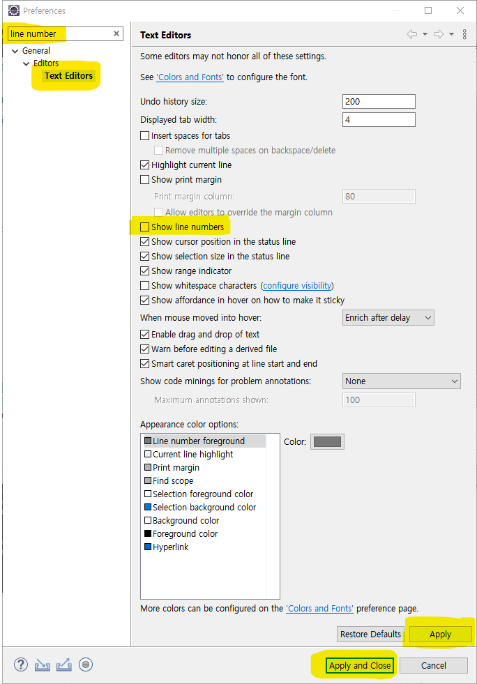 1.3. Show line numbers 를 선택 또는 선택해제 합니다.