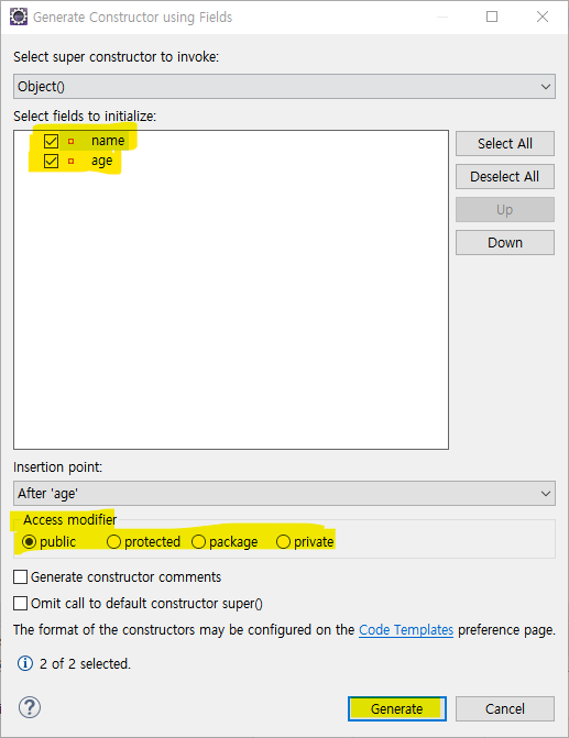 생성자에서 초기화할 field를 선택합니다.