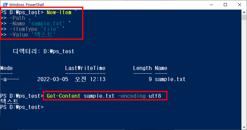Set-Content 명령어를 이용하여 'sample.txt' 파일을 생성하였습니다.