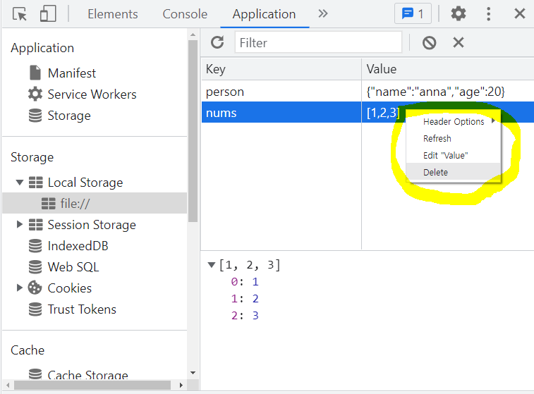 - localStorage 값을 선택하고, 마우스 오른쪽 버튼을 클릭하면,
