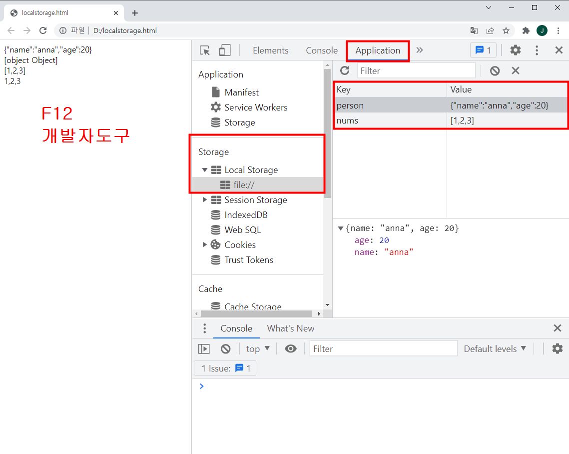 - 크롬 개발자 도구 (F12) > Application > Storage > Local Storage 에서 localStorage 값을 확인합니다.