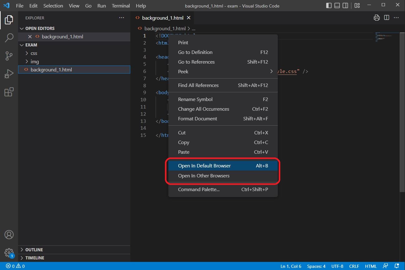 - 실행할 파일 선택 -> 마우스 오른쪽 버튼 -> Open in Default Brower 선택