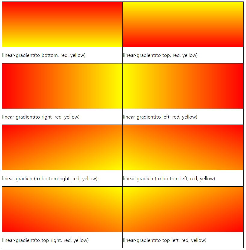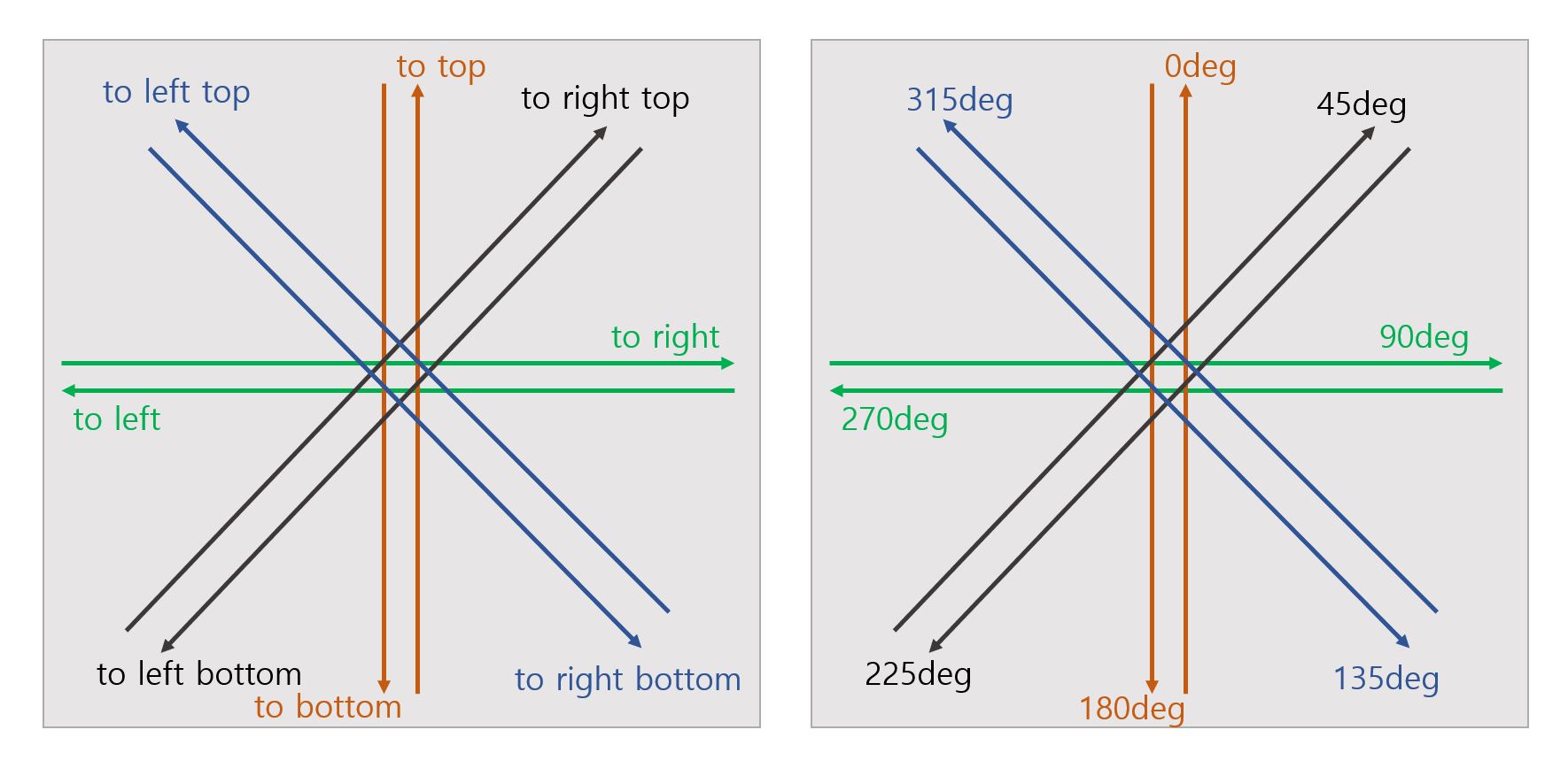 - left, right, top, bottom을 조합하여, 그라데이션 선의 방향을 지정합니다.