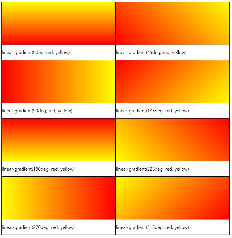 - 0deg, 45deg, 90deg...와 같이, 숫자로 그라데이션 선의 방향을 지정할 수 있습니다.