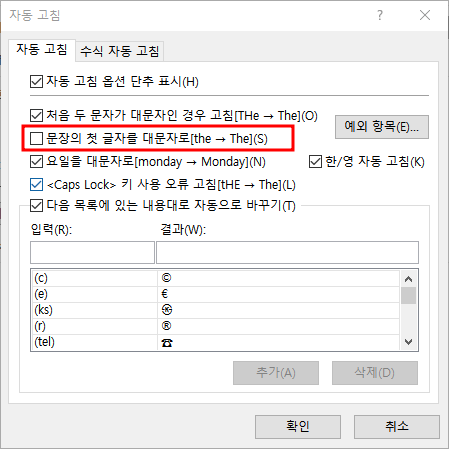 4. '문장의 첫 글자를 대문자로[the -> The]' 항목 선택 해제