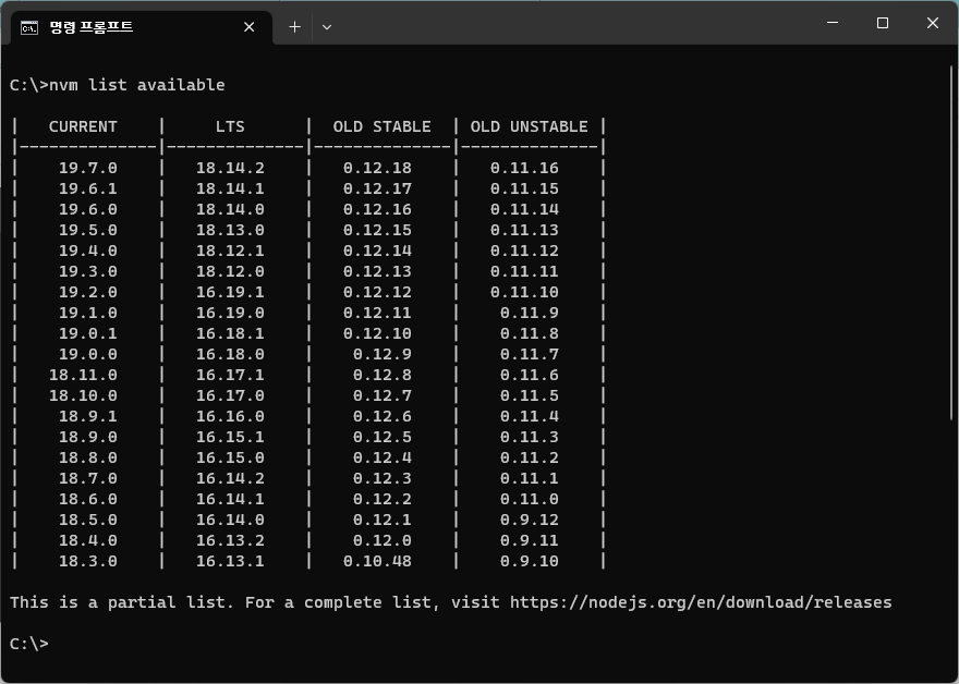 설치할 수 있는 node 버전을 command line에서 확인할 수 있습니다.