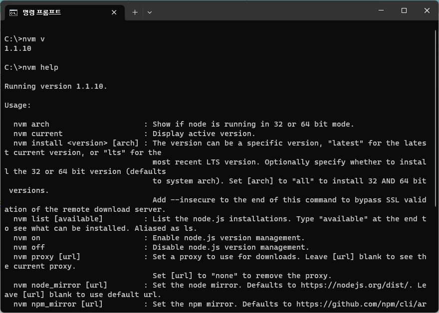 Windows CMD 또는 Powershell에서 NVM이 제대로 설치되었는지 확인합니다.
