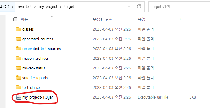 프로젝트 폴더의 target 폴더에도 jar 파일이 생성되고,