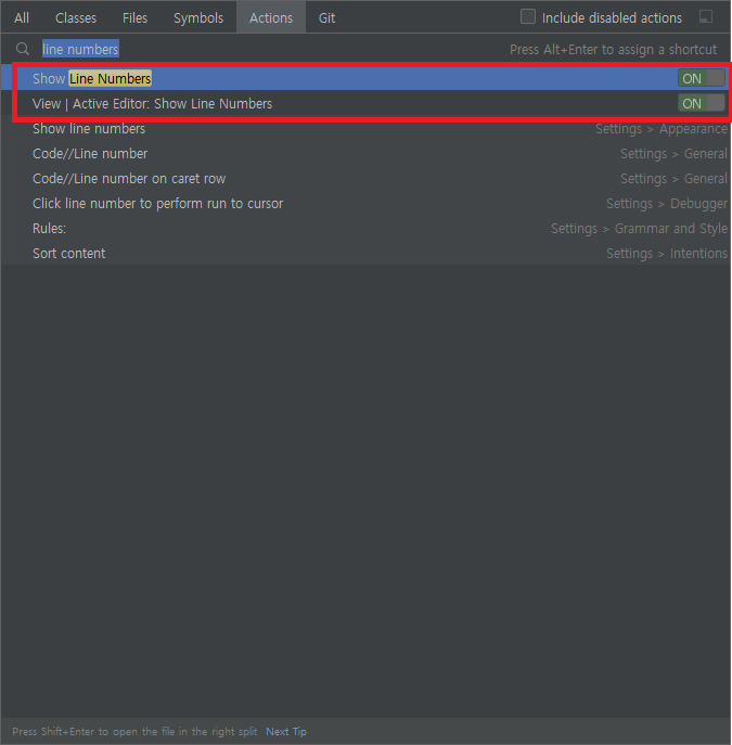 2. Ctrl + Shift + A, 'line numbers' 검색
