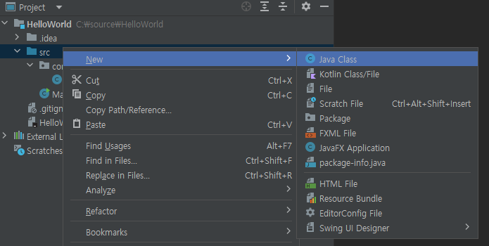 1-1. src 폴더 선택 > Alt + Insert (단축키) > Java Class 선택
