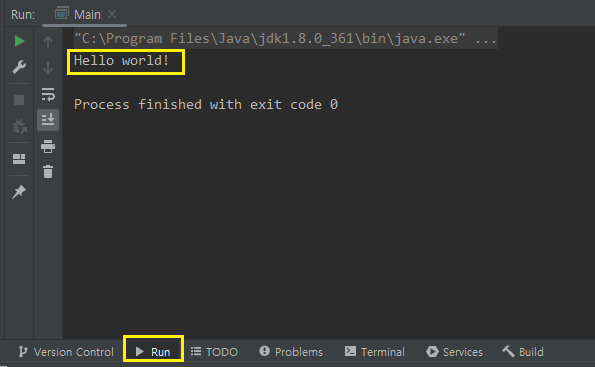 main() 함수가 실행되면, 하단의 Run 탭이 활성화되고, main() 함수 실행 결과가 출력됩니다.