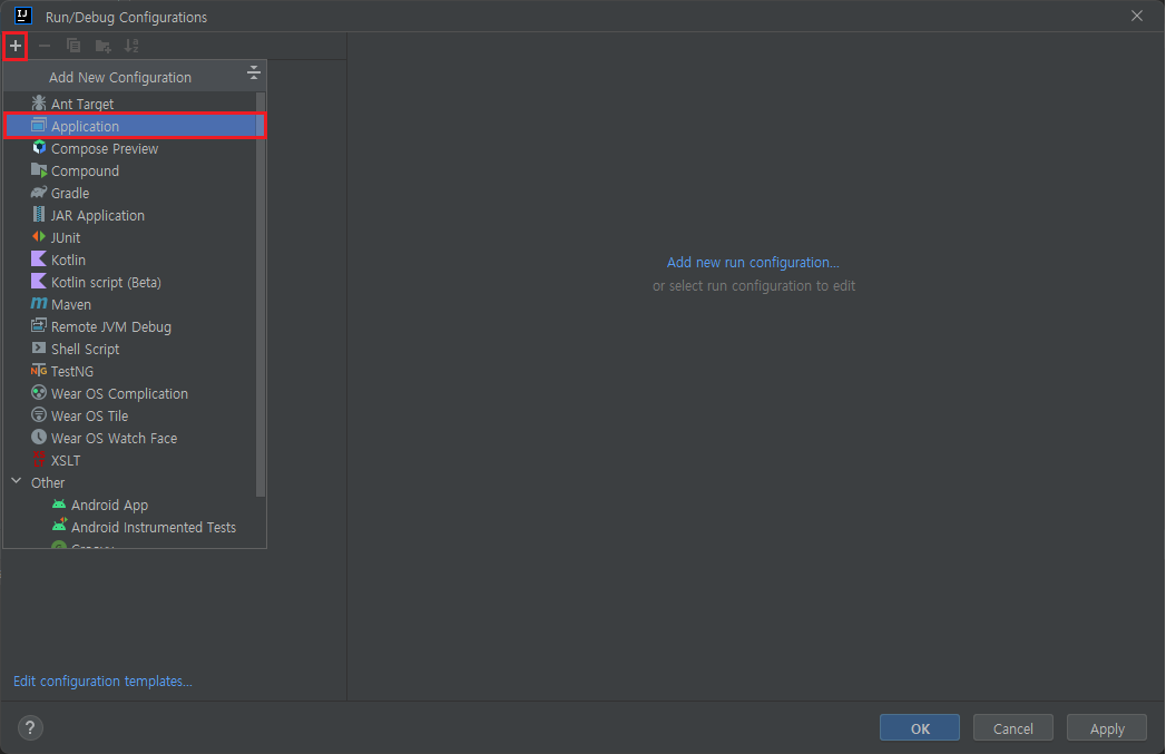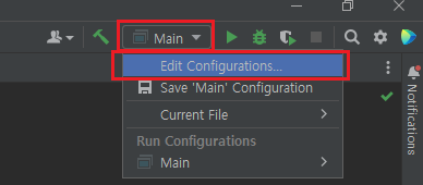 또는 오른쪽 상단에서 Edit Configurations를 선택할 수도 있습니다.