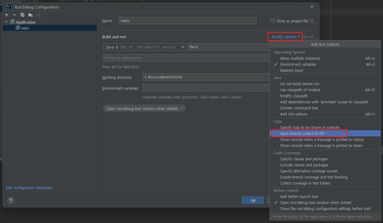 1. Run Configuration 선택 > Modify Options > Save console output to file
