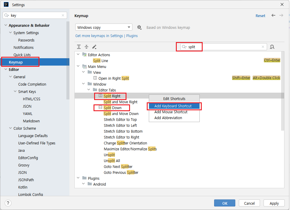 File > Settings > Keymap > 'split' 검색 > 'Split Right', 'Split Down' 더블클릭 > Add Keyboard Shortcut 선택