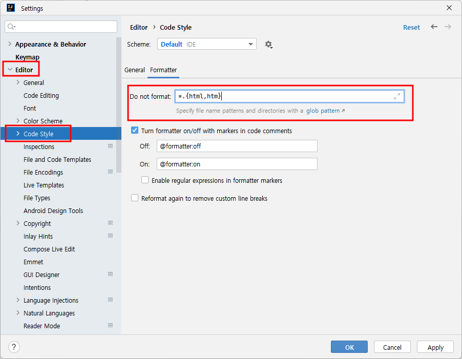 자동 포맷팅에서 제외할 파일의 파일명 패턴, 디렉토리 등을 지정할 수 있습니다.
