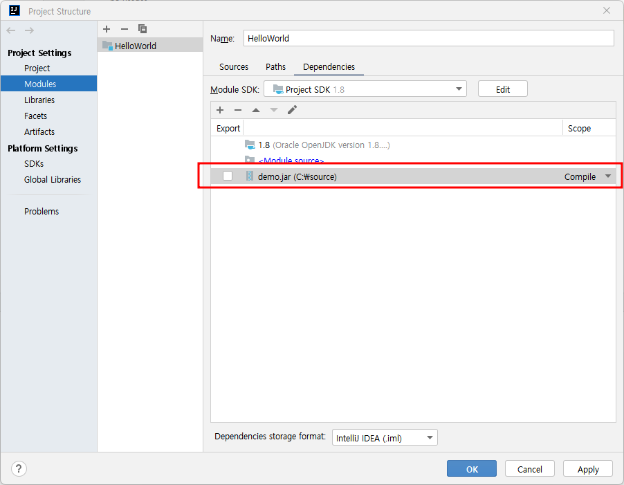 Dependencies 탭에서 선택한 jar가 추가된 것을 확인한 후,