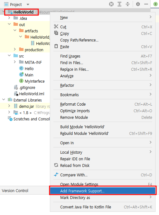 1. 프로젝트 선택(마우스 우클릭) > Add Framework Supoort 선택