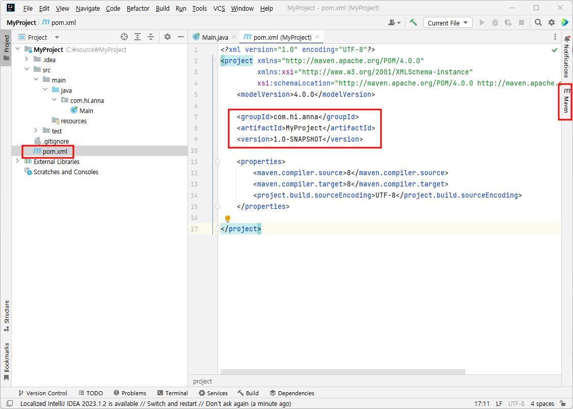 - pom.xml 파일의 GroupId, ArtifactId를 확인합니다.