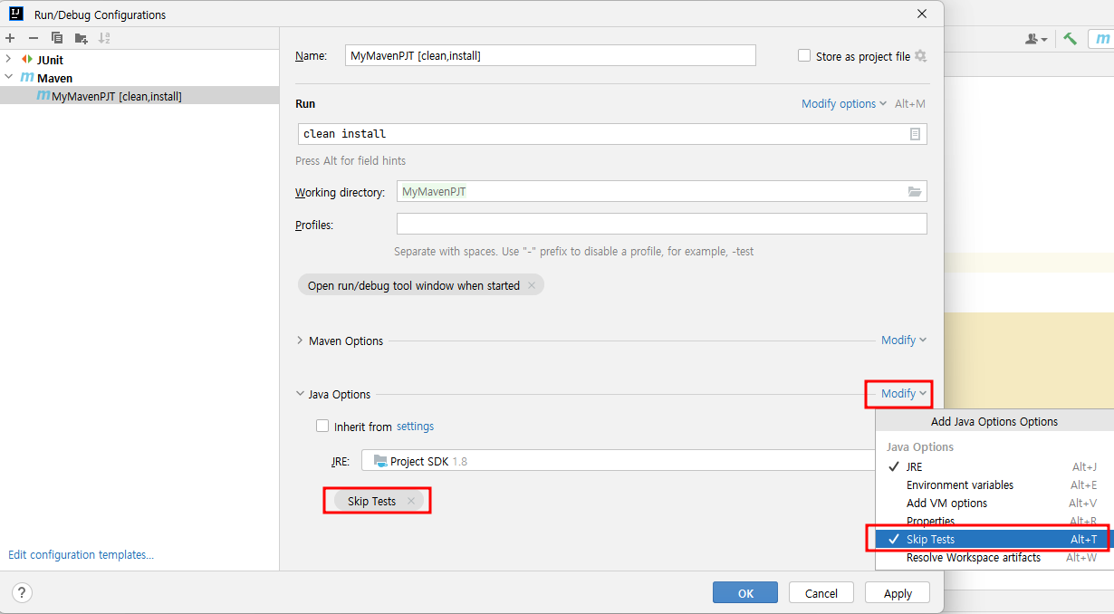 configuration의 java options에 'Skip Tests'를 추가합니다.