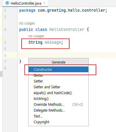 4. 다음과 같이 message를 매개변수로 갖는 생성자가 생성되었습니다.