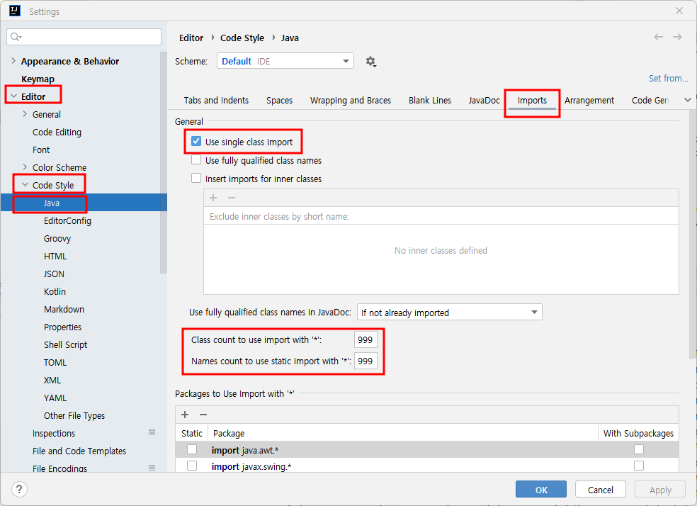 - Class count to use import with '*' : 최대값 999로 설정