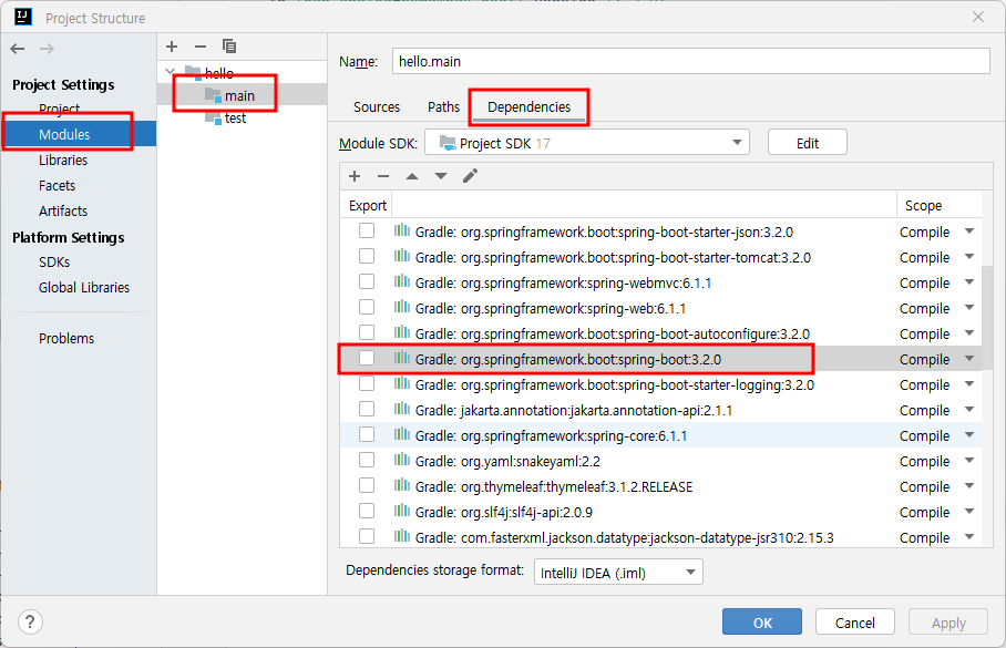 File > Project Structure > Project Settings > Modules > main > Dependencies