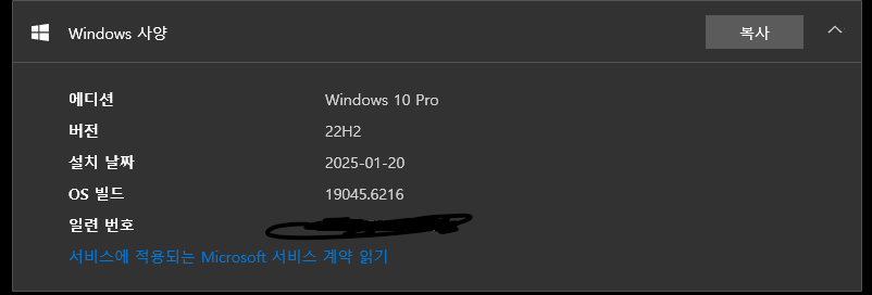 - "Windows 사양" 항목에서 에디션, 버전, OS 빌드 확인